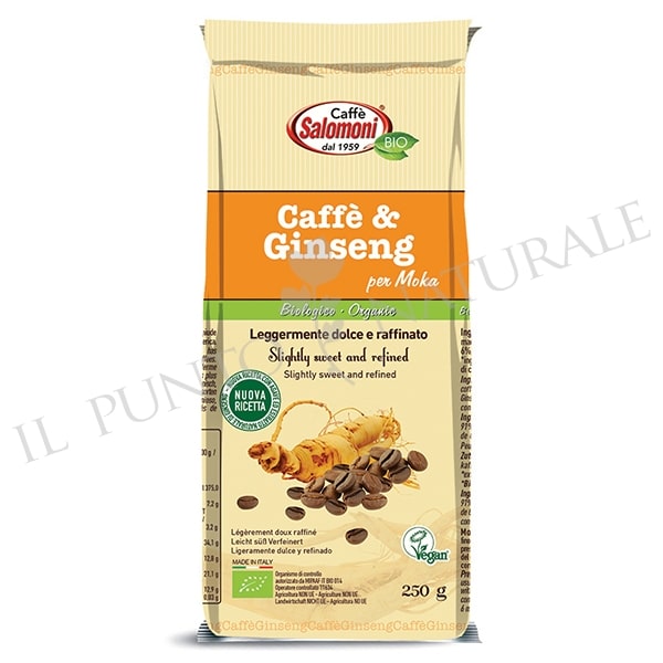 Caffè e Ginseng è prodotto dalla torrefazione Caffè Salomoni utilizzando miscela arabica di pregiate qualità di caffè provenienti da coltivazioni biologiche del Centro America, con aggiunta di aroma naturale di Ginseng.